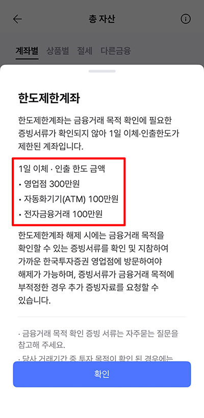 특히, 한국투자증권 한도제한계좌는 비대면 해제가 불가합니다. 타 증권사는 앱에서 서류 사진 찍어 보내면 풀어주기도 하던데, 유독 한국투자증권은 규정이 까다로워 무조건 영업점 방문을 통해서만 한도제한계좌 해지가 가능하더라구요.