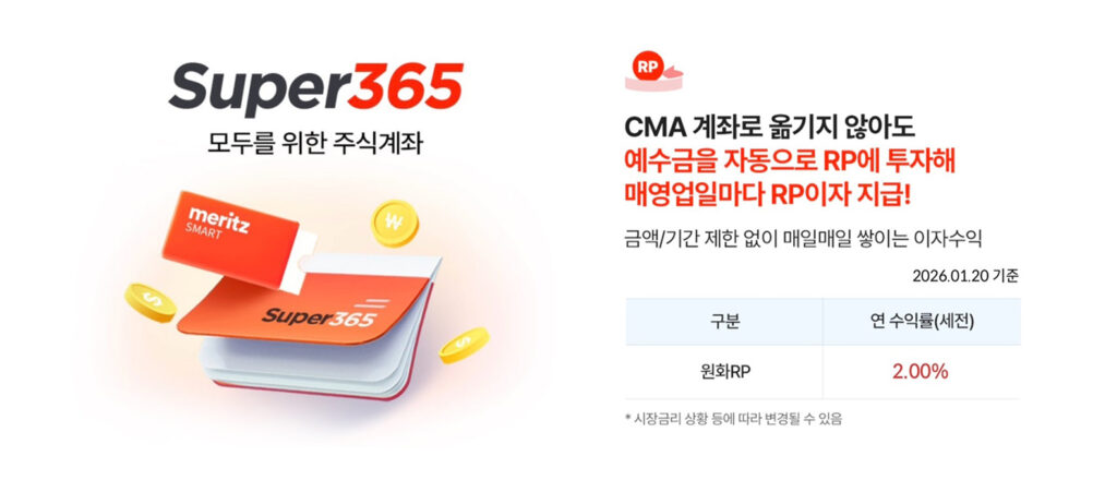 주식을 사지 않고 계좌에 넣어만 둔 원화&달러가 매일 밤 자동으로 RP(환매조건부채권)에 투자되어 이자를 낳는 시스템은, 저처럼 국내 외 주식을 병행하는 투자자에게는 놓칠 수 없는 혜택이었습니다. 오늘은 이벤트 종료 후에도 제가 왜 메리츠 슈퍼365를 선택했는지, 그 실전 활용기를 정리해 보겠습니다.
