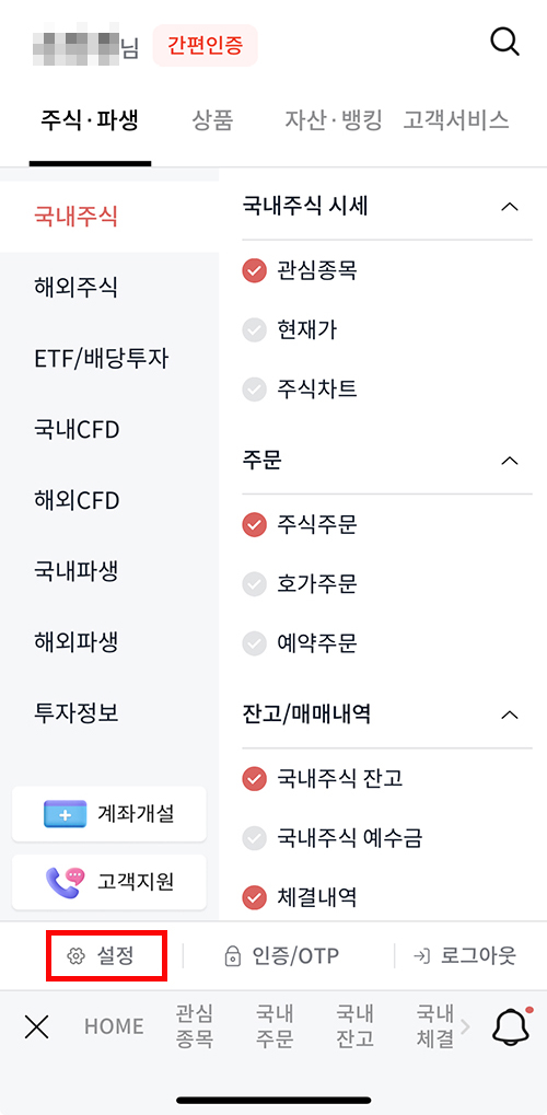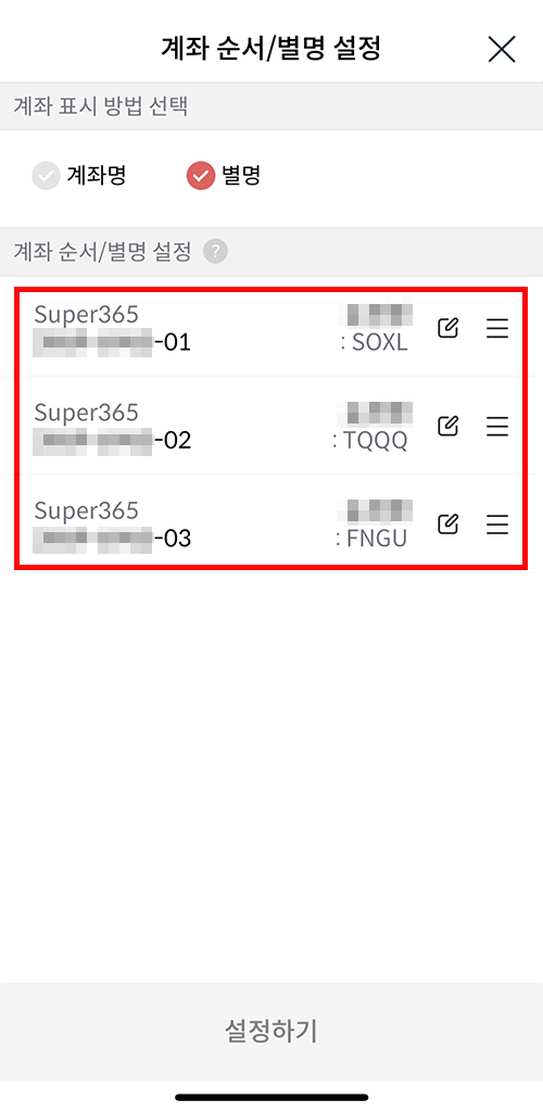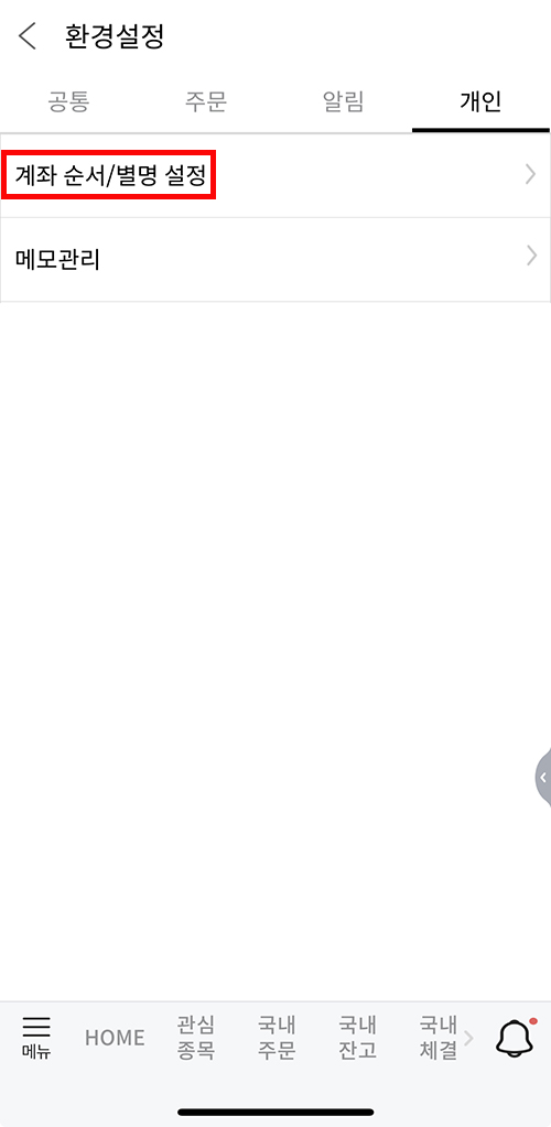 ✔ 메인 < 설정 < 개인 < 계좌 순서/별명 설정