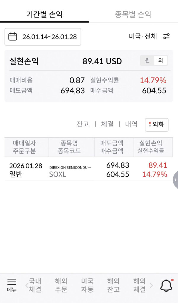 | 1사이클 (테스트) | 500만 원 (SOXL 단독) | 26.01.14 ~ 01.27 | 20회 | 9회차 | $604.55 | $89.41 |
