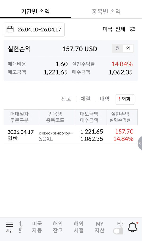 ① SOXL 무한매수 후기 4사이클 : 2026.04.10~04.17, 5회차 종료, 실현손익 $157.70