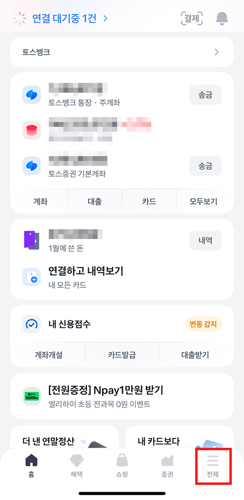 ① 토스뱅크 홈 화면 하단 오른쪽, ‘전체‘ 3줄 아이콘 클릭