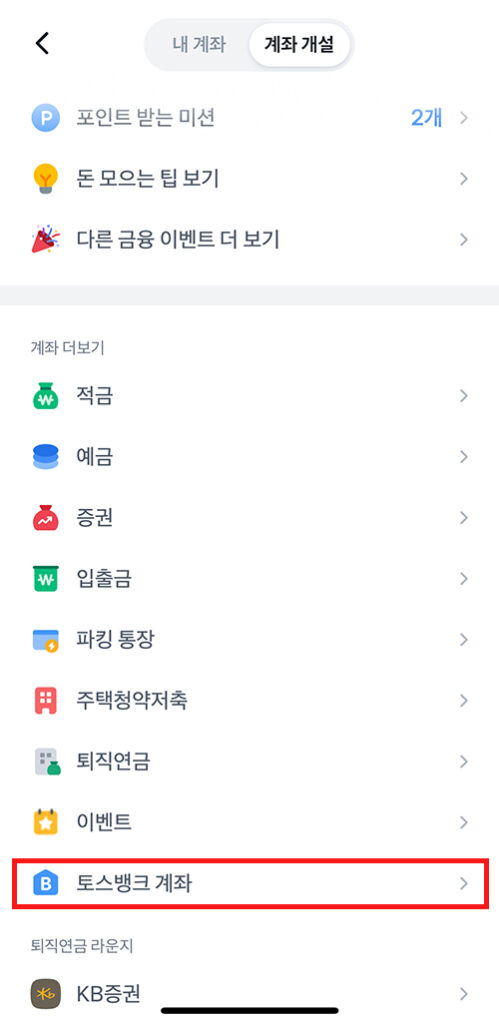 ③ 스크롤 해서 내리다 보면 나오는 ‘토스뱅크‘ 계좌 클릭