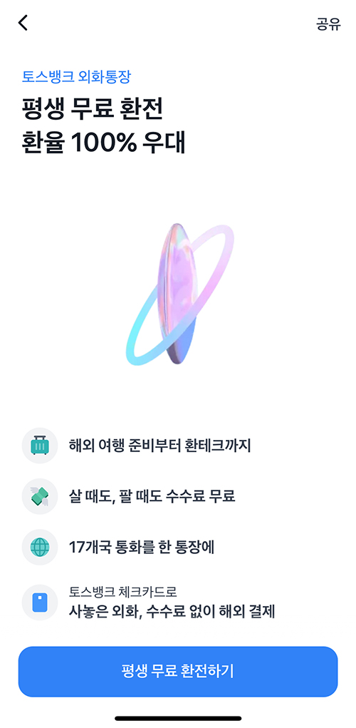⑤ ‘평생 무료 환전하기‘ 클릭, 토스 외화통장 개설 완료!💰