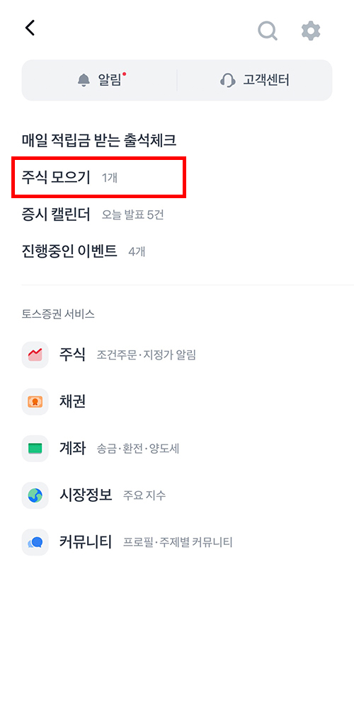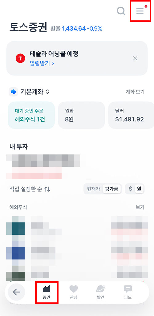 - 토스 앱 실행 후 하단 [주식] 탭 클릭 < 오른쪽 위 메뉴 아이콘 클릭