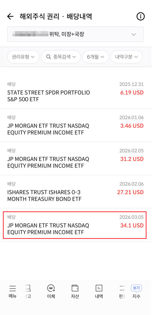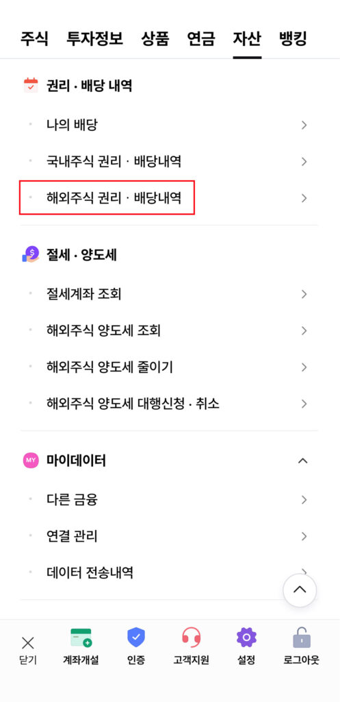 🔍 메뉴 < 자산 < 권리ㆍ배당 내역 < 해외주식 권리ㆍ배당 내역