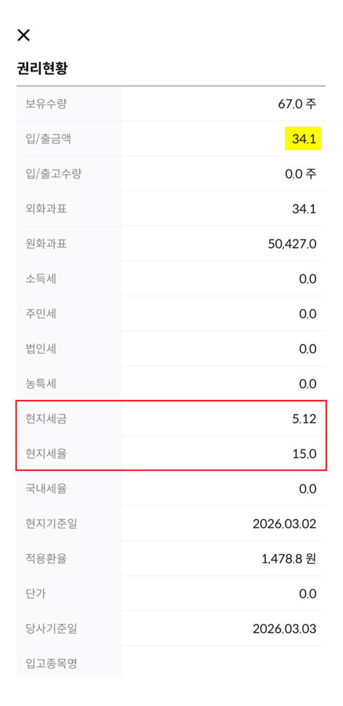 | 기본 세율 | 미국 원천징수 15% | 거래내역 내 ‘현지세’ 확인 |